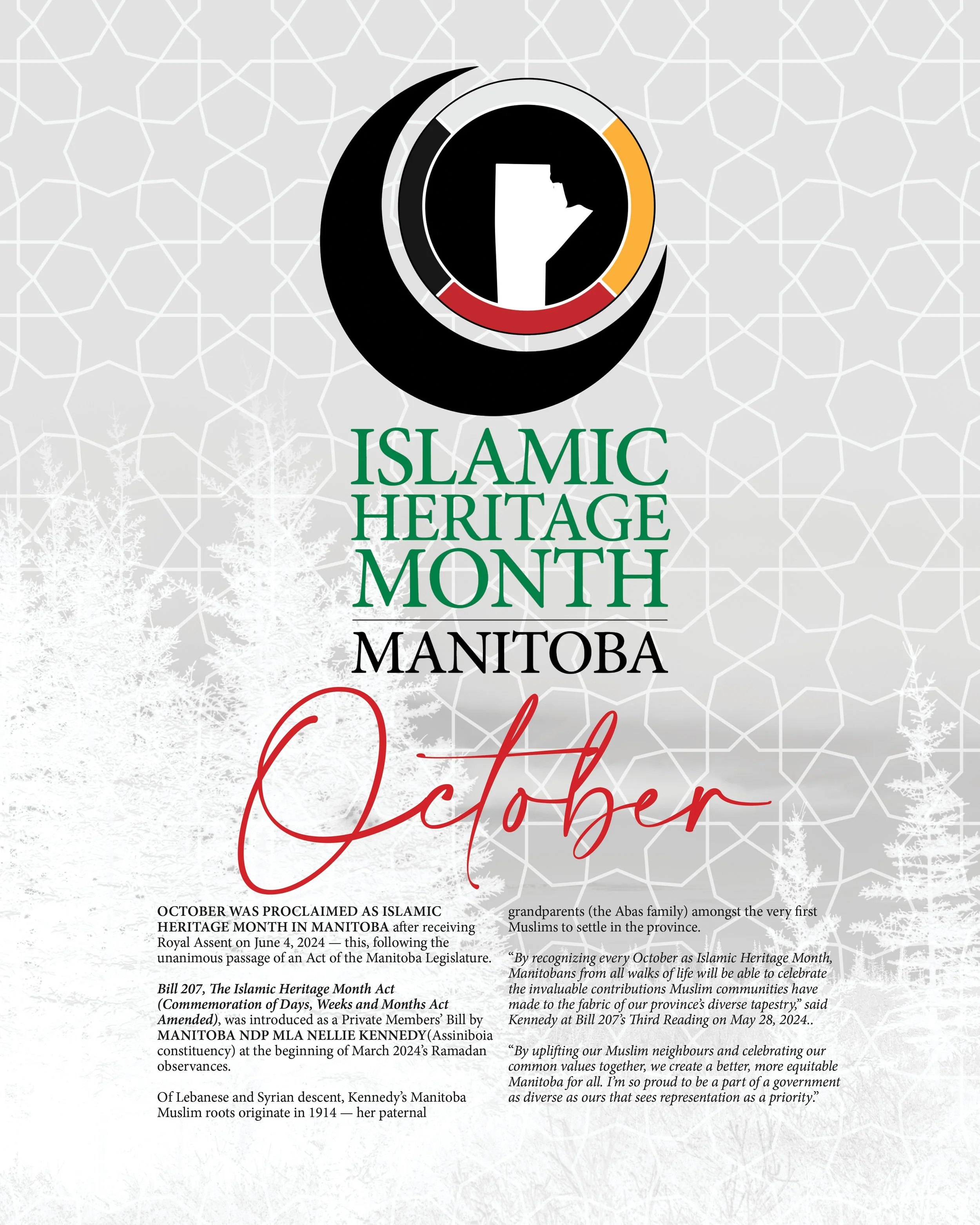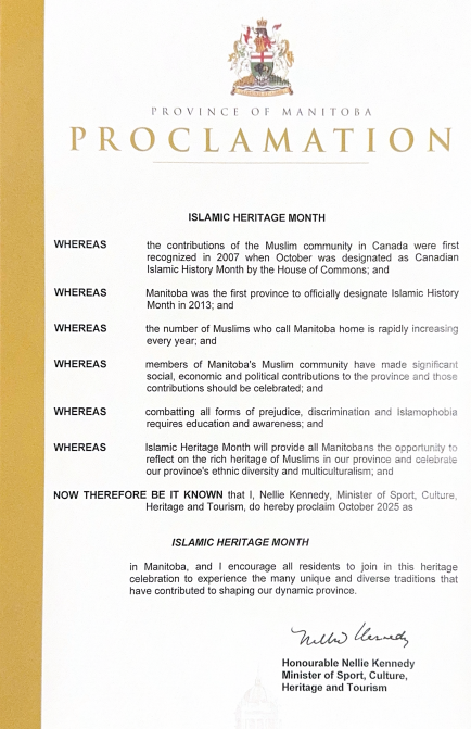 The Province of Manitoba officially proclaims October as Islamic Heritage Month, recognizing and celebrating the valuable contributions of the Muslim community to the province’s cultural, social, and economic fabric. First acknowledged nationally in 2007 and officially designated in Manitoba in 2013, Islamic Heritage Month provides an opportunity for all Manitobans to reflect on the rich heritage, traditions, and diversity of Muslims in the province. The proclamation also emphasizes the importance of combating prejudice, discrimination, and Islamophobia through education and awareness, while encouraging unity and appreciation of Manitoba’s multicultural identity.